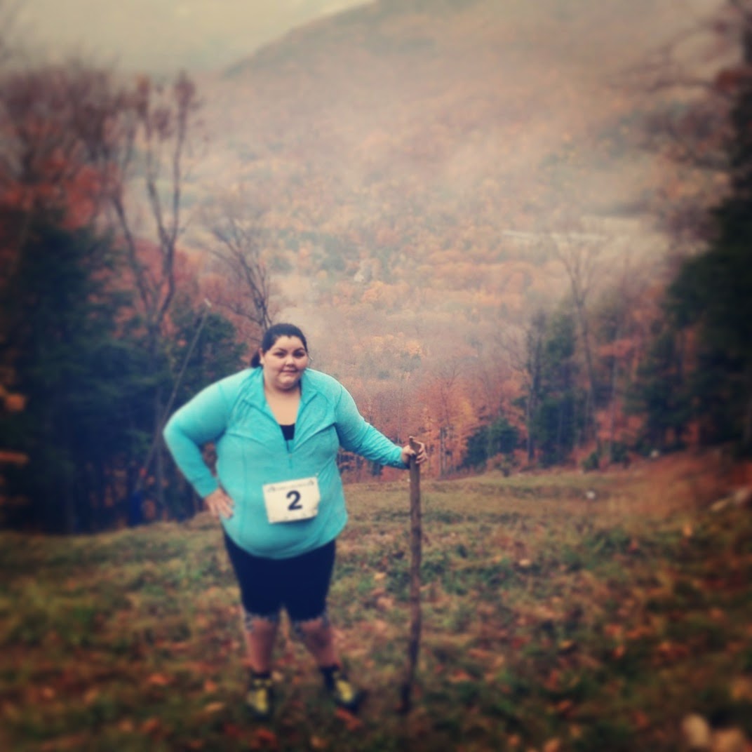 My other goal for the challenge was to finish without sustaining a serious injury or dying on the mountain. Seems like it would be another easy take, right? Wrong. I obviously didn't die, and I didn't sustain injuries (physically) but I did sustain a pretty big blow to my ego. The start to the run was up part of a ski hill, down the same hill, on the pavement for a little bit, then on a trail. Starting out I was okay. It was a little slippery and my socks got wet almost instantly, but it was totally doable. Of course I was the last one, but I was fine with it. I knew I wasn't coming in first- this was a total personal challenge for me. It started out as a really nice hike. I can't believe I said that, but it was nice! I made it to this part in the challenge that was absolutely terrifying & it started to rain. I started out having to get myself over this tall pipe in the ground- done. Then after that pipe is where all hell broke loose. We were in this very narrow, steep part of the woods. Before I knew it, the other heats were gaining on us. I hate holding people up, so I tried my best to get out of the way for the other crazies that were running! It was so scary in there. There was peat moss- I didn't even know that was really found outside- I thought that it was just sold at craft stores!! There were so many rocks, trees, and leaves. My foot got caught in some peat moss, and I freaked out. All I had to do was simply lift my foot up. But me being the drama queen that I am, lost it and started crying. Like, why would I ever think that crying would get my foot out? LOL. Then I saw the sign that said "You have risen 250ft." ARE YOU KIDDING ME? I could have sworn we were already more than half way. So then I cried again because we were less than a quarter of the way done. All the people from the other heats were flying by me, and I was getting discouraged. Why would I think that I would ever be able to finish this? I wasn't like any of these other people. I'm not limber and I have no idea how to maneuver the outdoors. We were almost at the top of this part of the mountain. There was this guy (Brent) at the top that just kept yelling, "Come on CrossFit girl!" He was so nice, but all I could think was please be on your way- I do not need anyone else waiting for me or looking at me- I was a hot crying mess! Below us there was a guy sitting on a rock, eating a snack (Greg). He looked like one of the guys that was in our group, so I started yelling for him....it wasn't that guy, so now I looked like a crazy for sure! I tried to focus myself back on the task at hand. I was going to take a step, and my foot got stuck again, this time in a little hole in between rocks. I cried again. I could see Brent at the top, and now Greg was beside me. I could see the top, and it looked flat. All I had to do was get up there. Brent grabbed my hand, and helped me up over the last big rock. I was so happy to be on flat ground, so what do you do when you're happy? You cry! haha. We stopped to take a breather, and of course our new friends Greg and Brent stayed with us. I kept trying to tell them to go, that we were fine, and they just said no- they wanted to hang out with us. Greg gave us some energy chews- they could've been poison, and I would have still taken them!